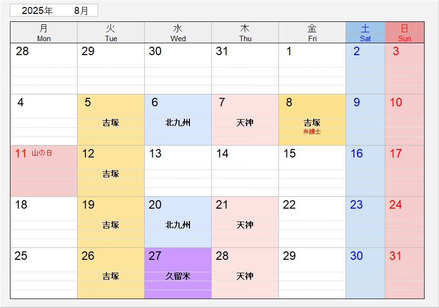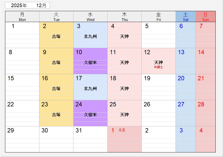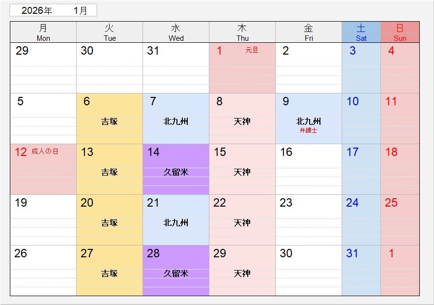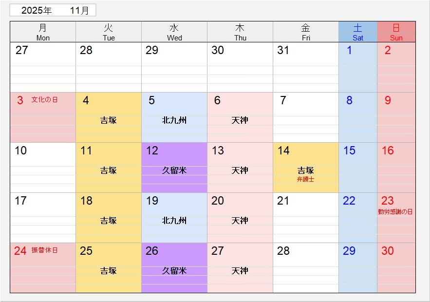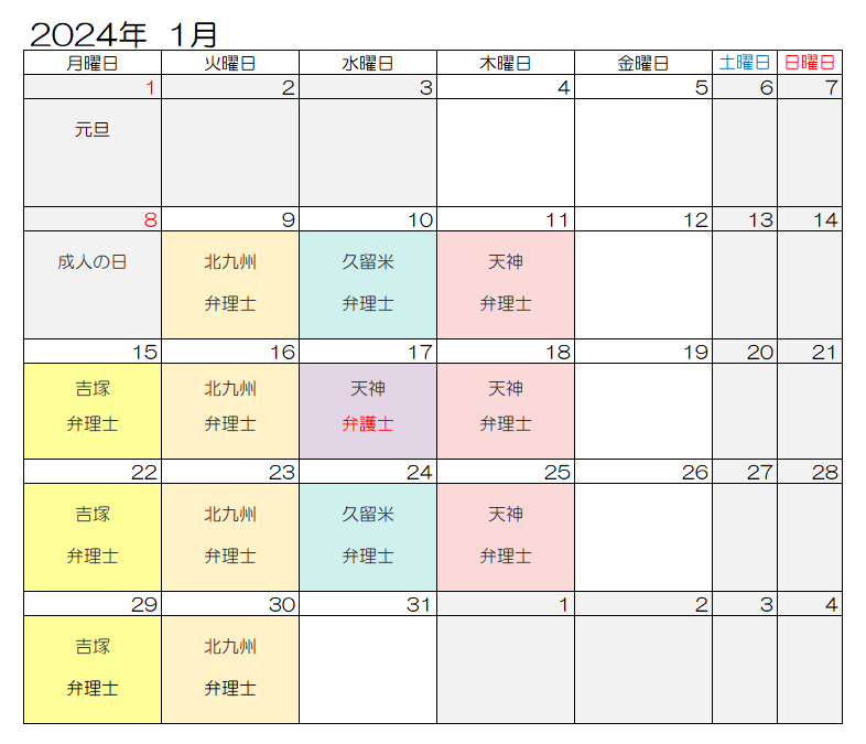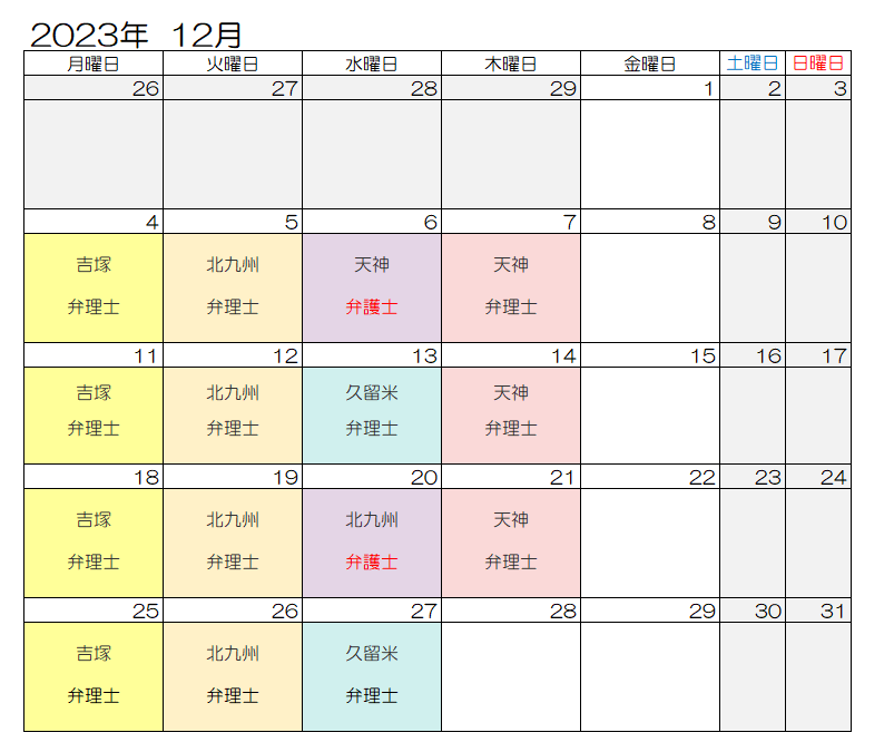 火曜日(吉塚)、第1・第3水曜日(北九州)、木曜日(天神) 第2・第4水曜日(久留米)、第2金曜日(弁護士相談) |