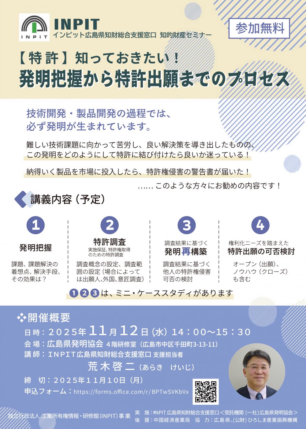 INPIT広島県知財総合支援窓口では今年度、企業の成長に寄与する知的財産を活用したセミナーを6回、開催いたします。