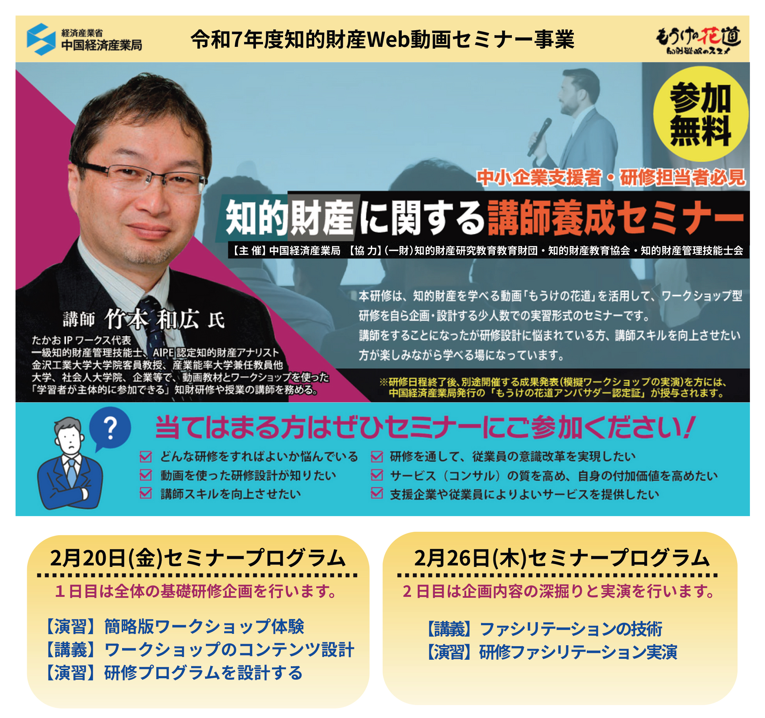 2/20,2/26 知的財産に関する講師養成セミナー 中小企業支援者・研修担当者必見!