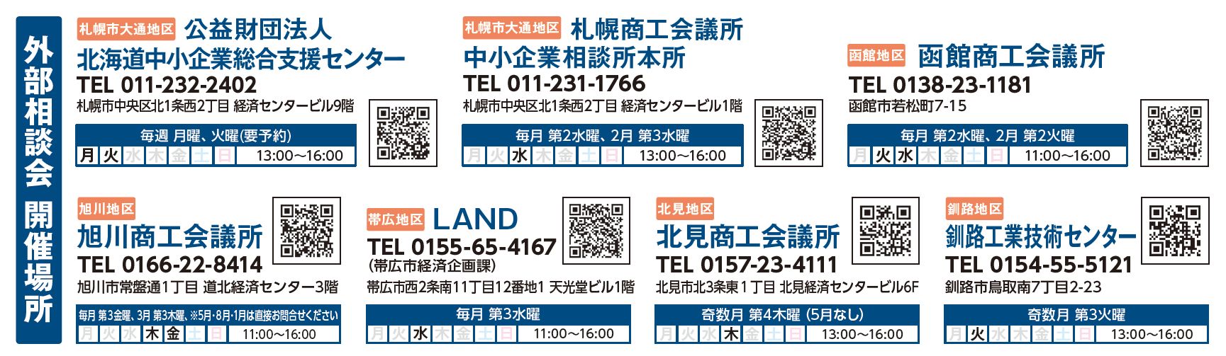 また、道内7箇所(札幌市2箇所、函館市、旭川市、帯広市、北見市、釧路市)で定期的な外部窓口相談を実施しております。(無料)