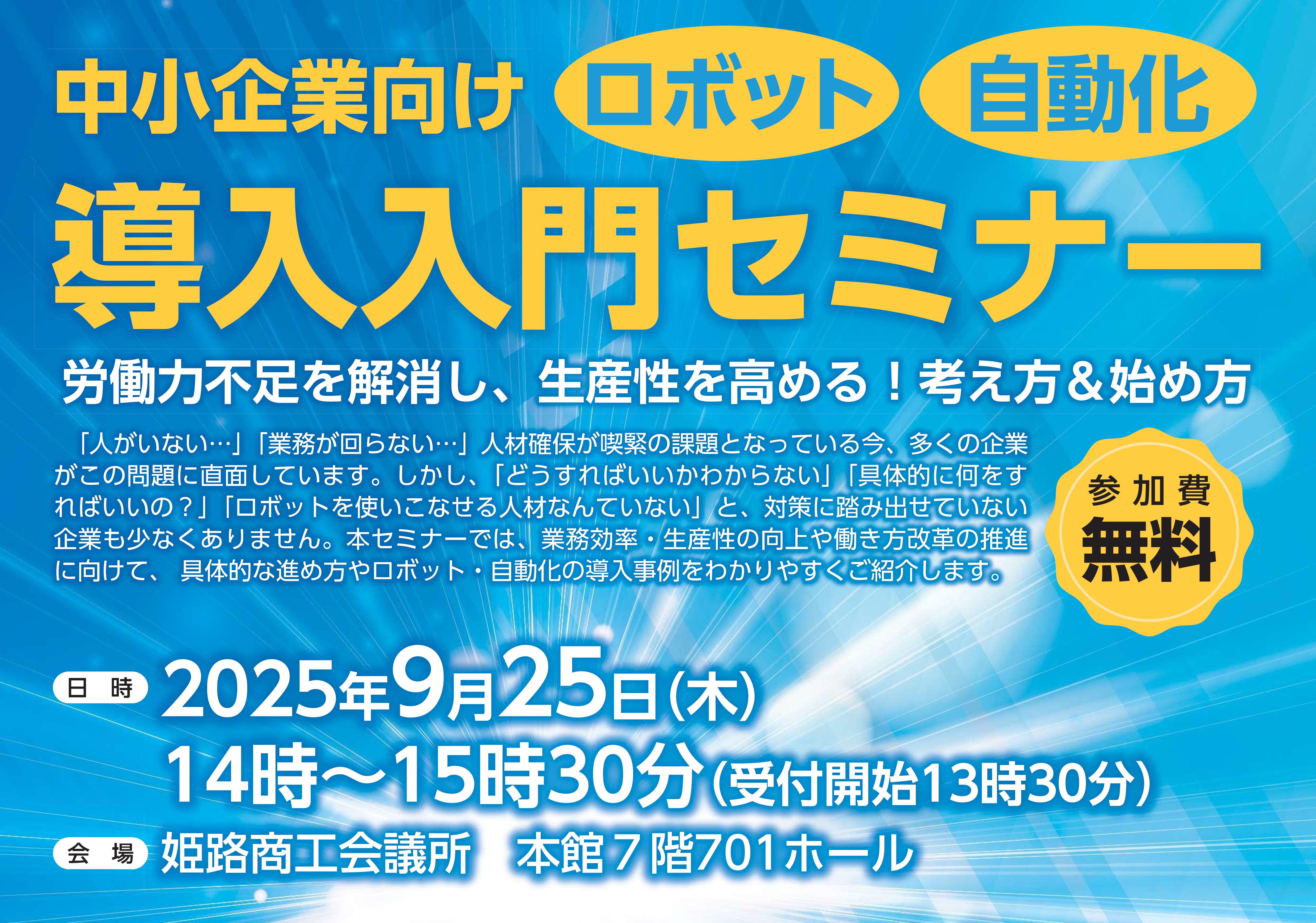 中小企業向けロボット・自動化導入入門セミナー9/25(姫路商工会議所)