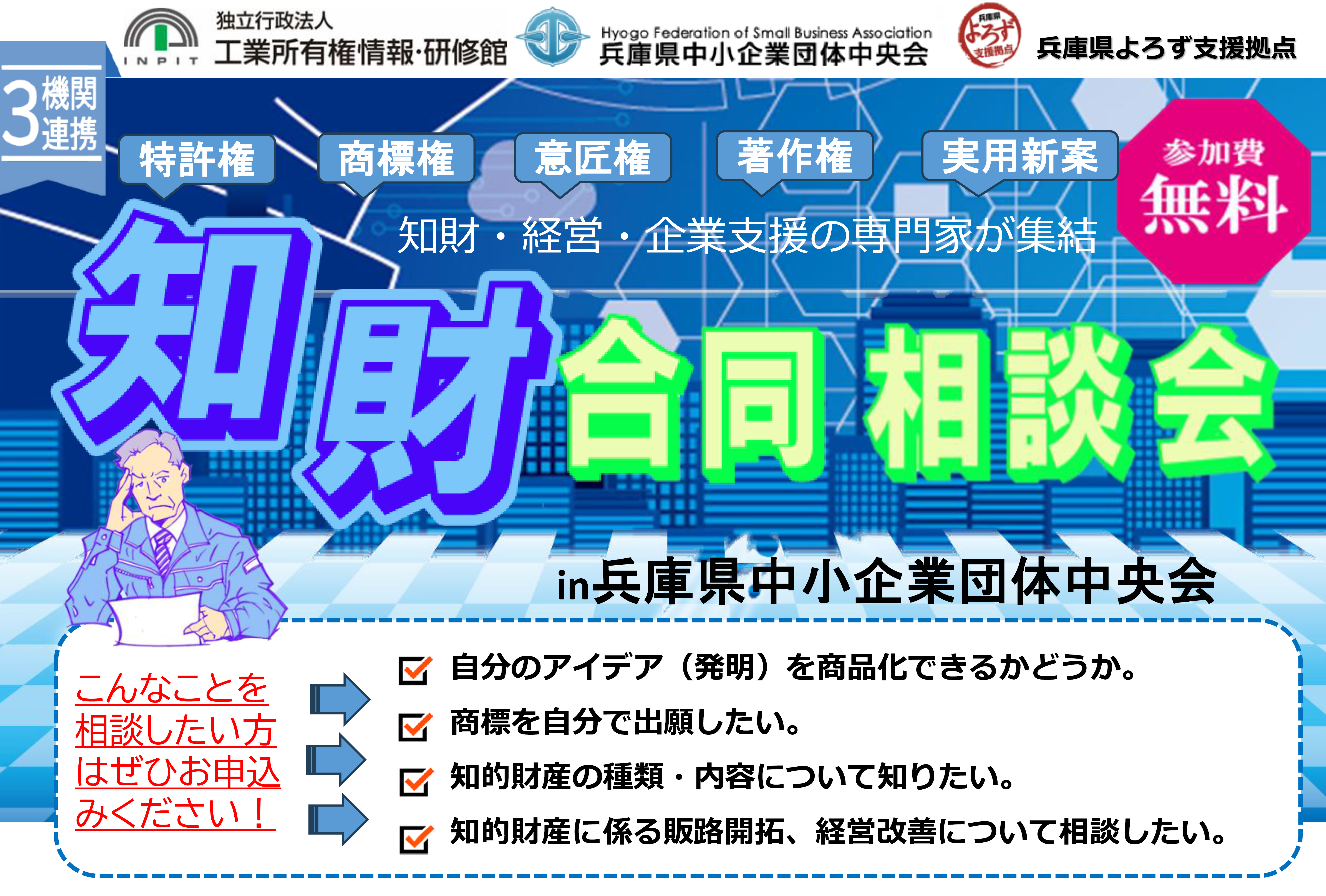 INPIT兵庫県知財総合支援窓口の3機関連携で相談承ります。相談ご希望の方は是非ご利用ください。