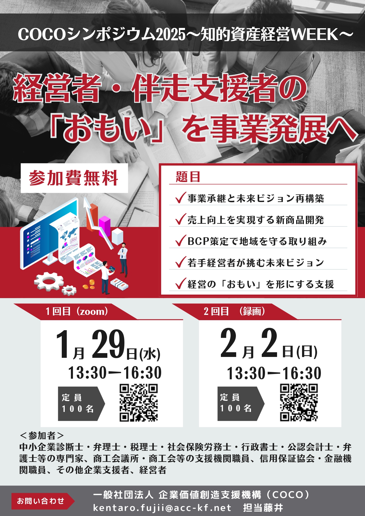 【法人企業価値創造支援機構】オンライン開催(1/29,2/2)COCOシンポジウム2024~知的資産経営WEEK~経営者・伴走支援者の「おもい」を事業発展への開催について
