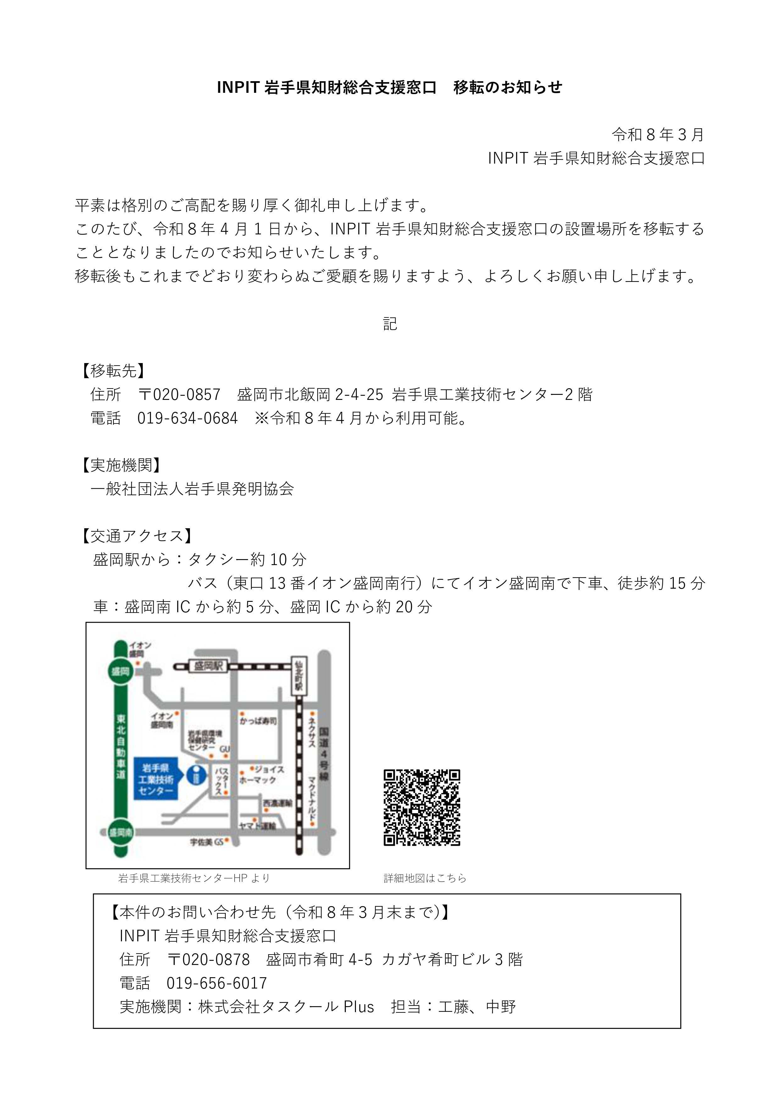 INPIT岩手県知財総合支援窓口 移転のお知らせ