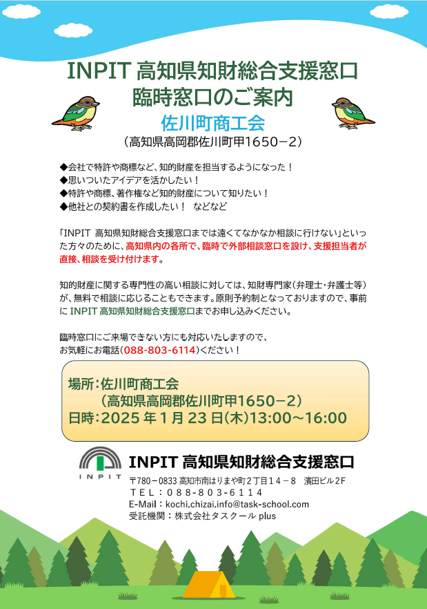 原則予約制となっておりますので、事前にINPIT高知県知財総合支援窓口までお申し込みください。