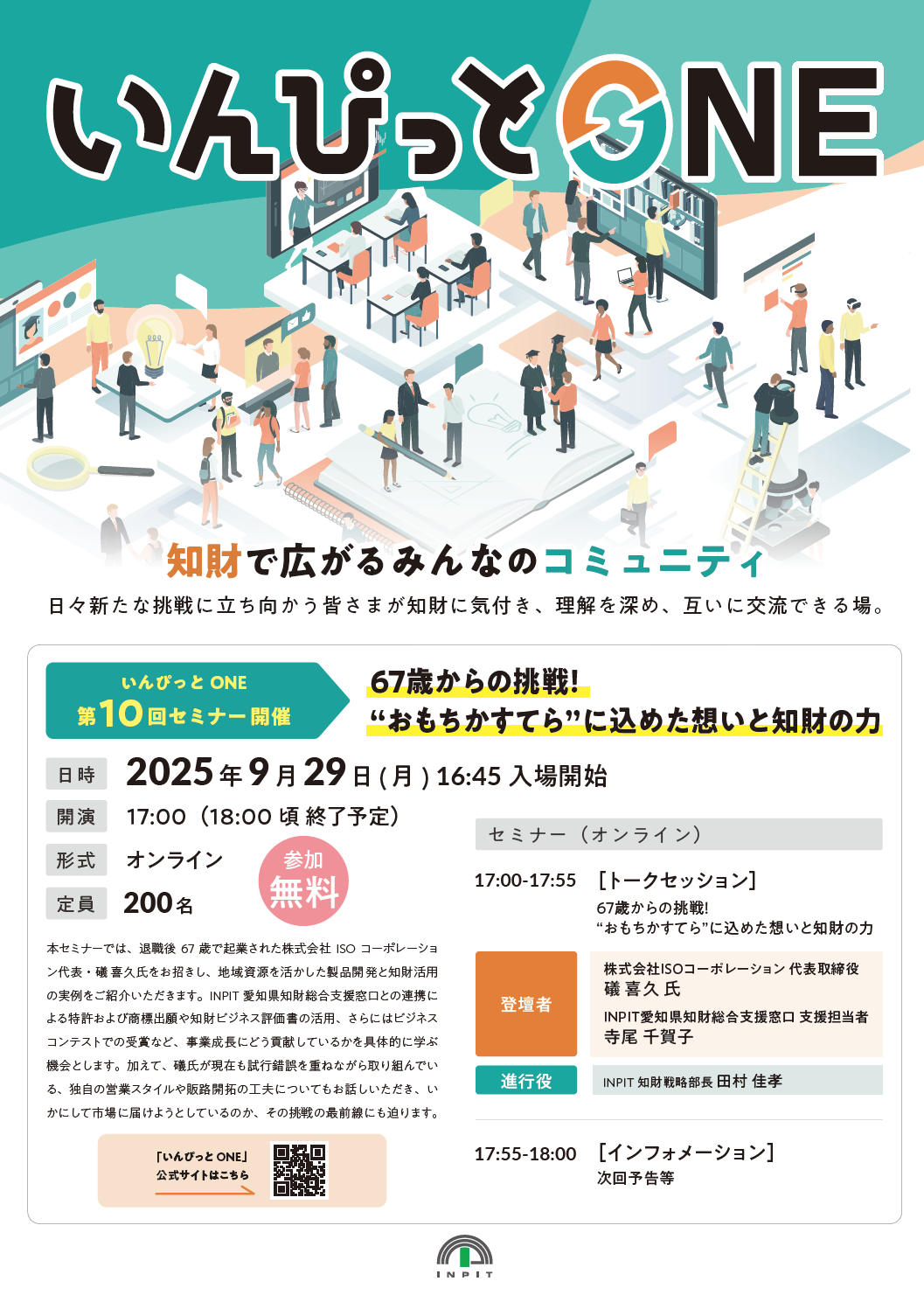 本セミナーでは、退職後67歳で起業された株式会社ISOコーポレーション代表・礒 喜久氏をお招きし、地域資源を活かした製品開発と知財活用の実例をご紹介いただきます。INPIT愛知県知財総合支援窓口との連携による特許および商標出願や知財ビジネス評価書の活用、さらにはビジネスコンテストでの受賞など、事業成長にどう貢献しているかを具体的に学ぶ機会とします。加えて、礒氏が現在も試行錯誤を重ねながら取り組んでいる、独自の営業スタイルや販路開拓の工夫についてもお話しいただき、いかにして市場に届けようとしているのか、その挑戦の最前線にも迫ります。