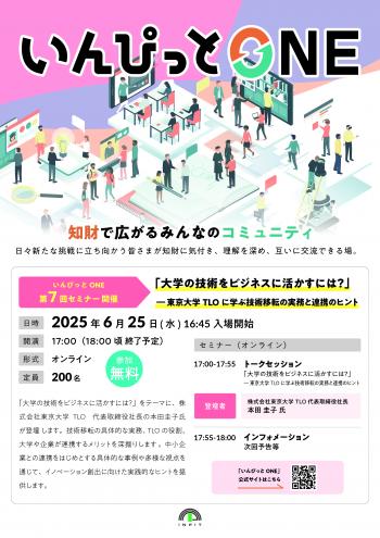 「いんぴっとONE」は、中小企業、大学、支援機関等の関係者が、知財に気付き、理解を深め、相互に交流できる場を提供いたします。