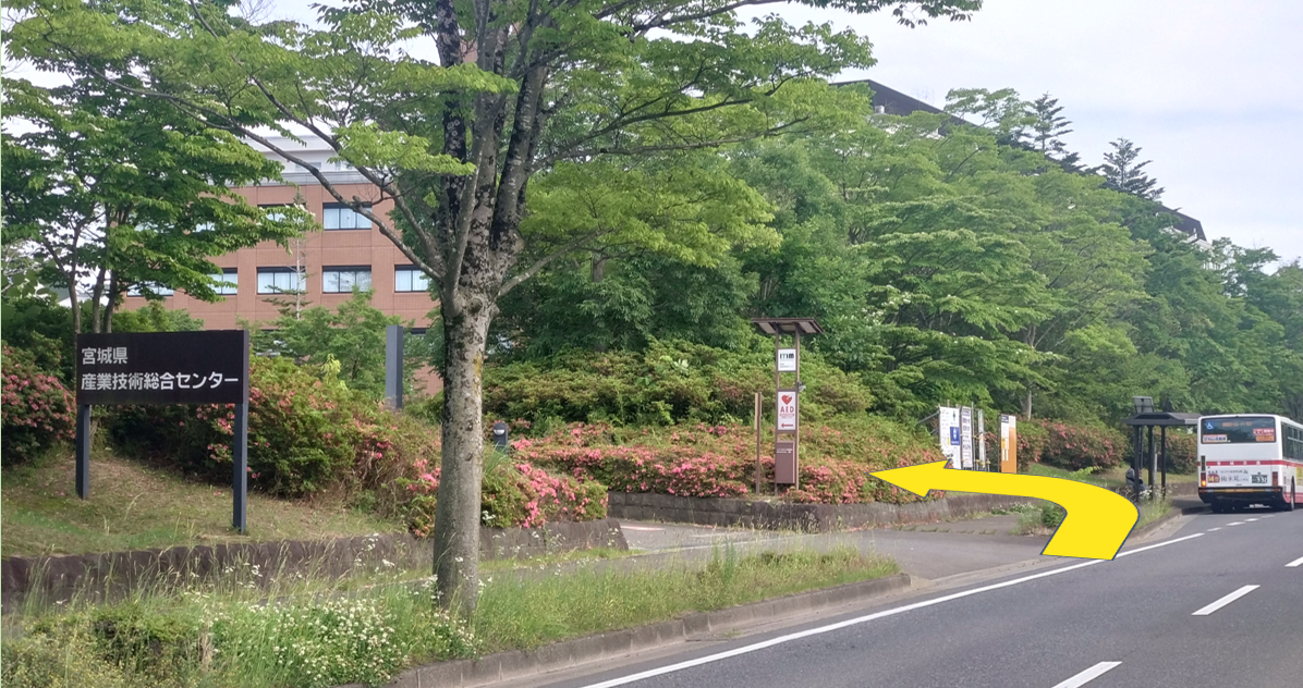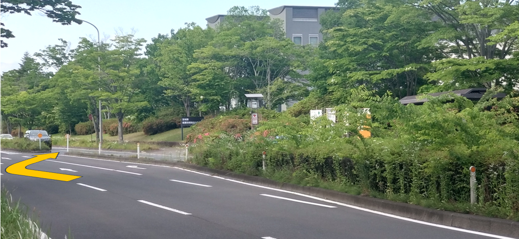 | 県道からの入口 南方(仙台市青葉区方面)から | ・県立図書館前の信号を通過 ・宮城大学前の信号を通過 ・右レーンを200m走行 ・右折レーンに入ってから右折 |