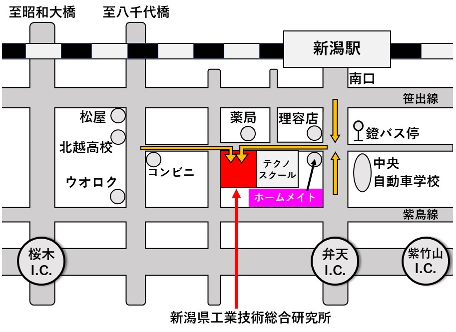 なお、研究所の隣の新潟テクノスクールの駐車場に間違って入らぬよう、ご注意ください。