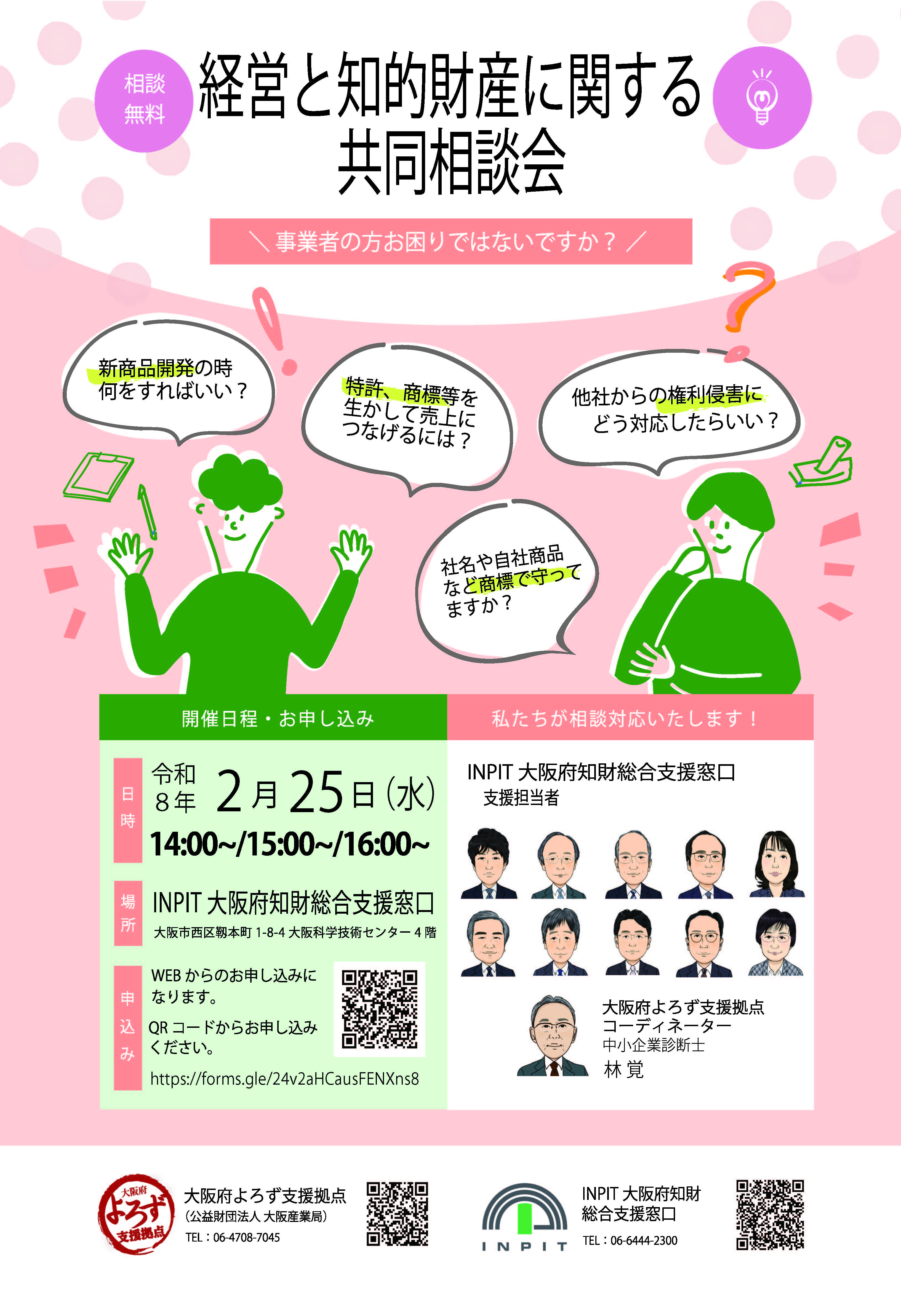 日頃は、INPIT大阪府知財総合支援窓口ならびに大阪府よろず支援拠点のご利用、誠にありがとうございます。令和7年度も両拠点はタッグを組み、中小企業様の経営と知的財産に関する一体型相談会を8月・10月・12月・2月の全4回にわたり開催しております。今回は、第4回の開催案内でございます。