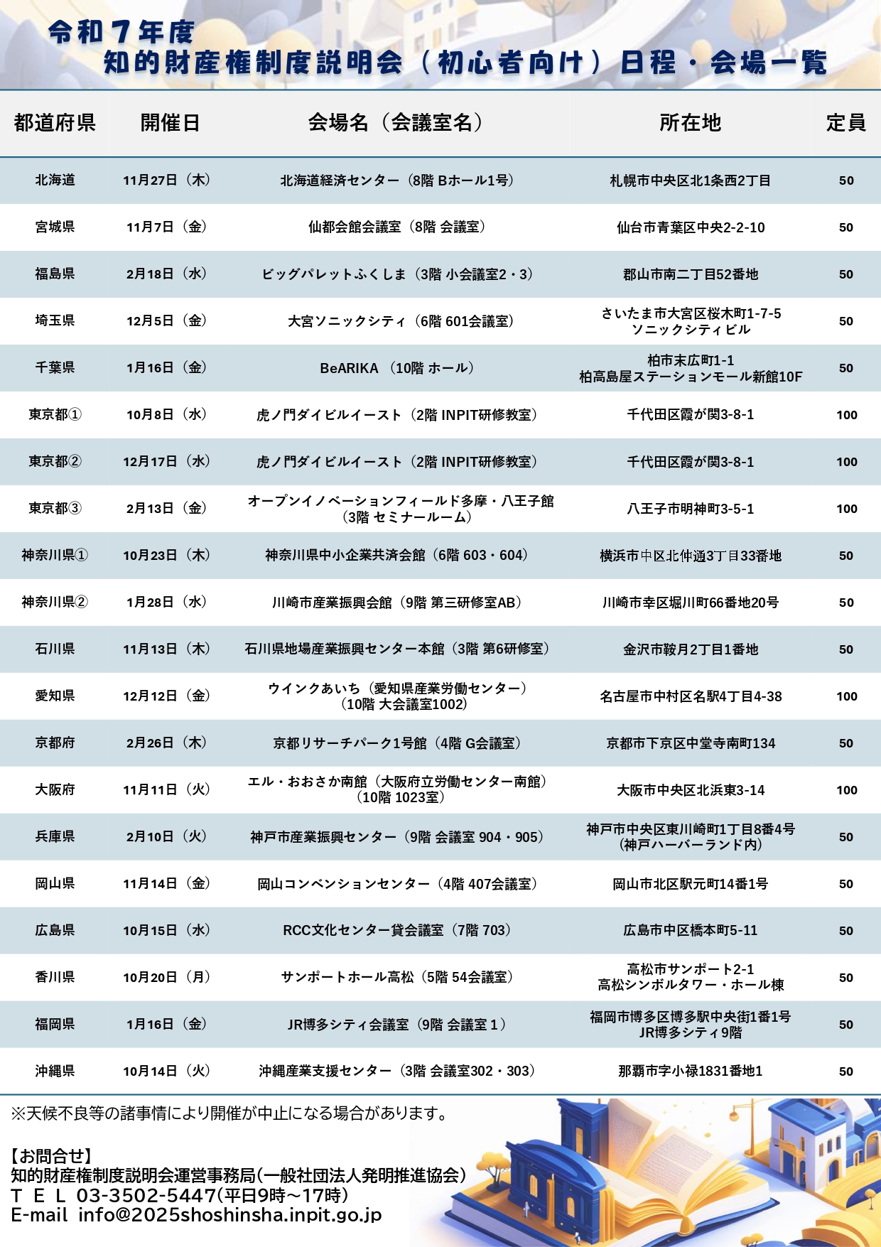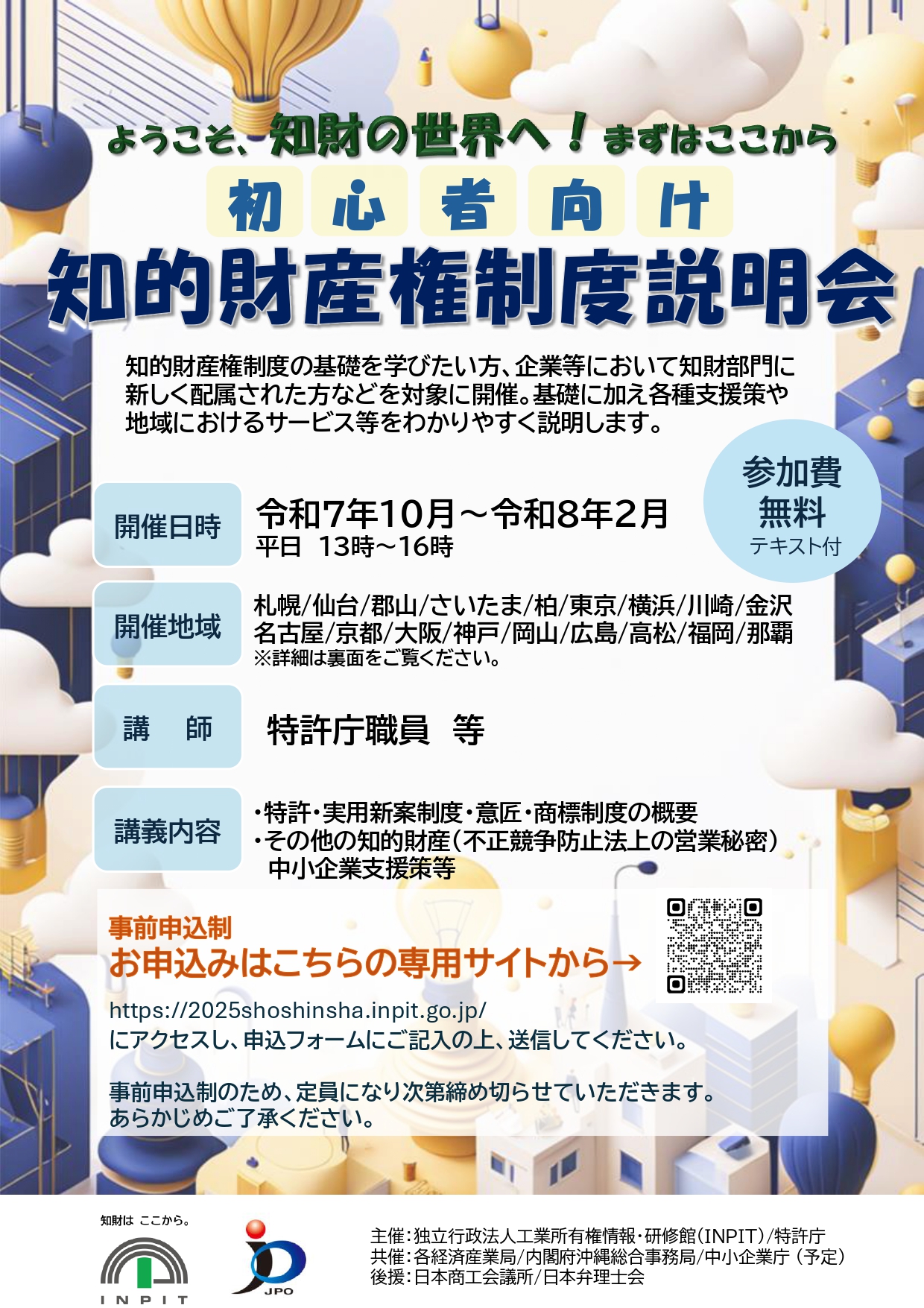 令和 7 年 10 月~令和 8 年 2 月において特許庁職員等を講師に迎え、これから知的財産権を学びたい方、企業等において知財部門に新しく配属された方などの初心者を対象とした無料の説明会を17都道府県でリアル開催します。