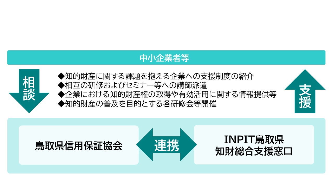 特許権や商標権等の出願や他社特許権調査、模倣品対応や権利侵害トラブルへの対応支援など、知的財産権に関する相談に対して鳥取県信用保証協会と連携しサポートいたします。