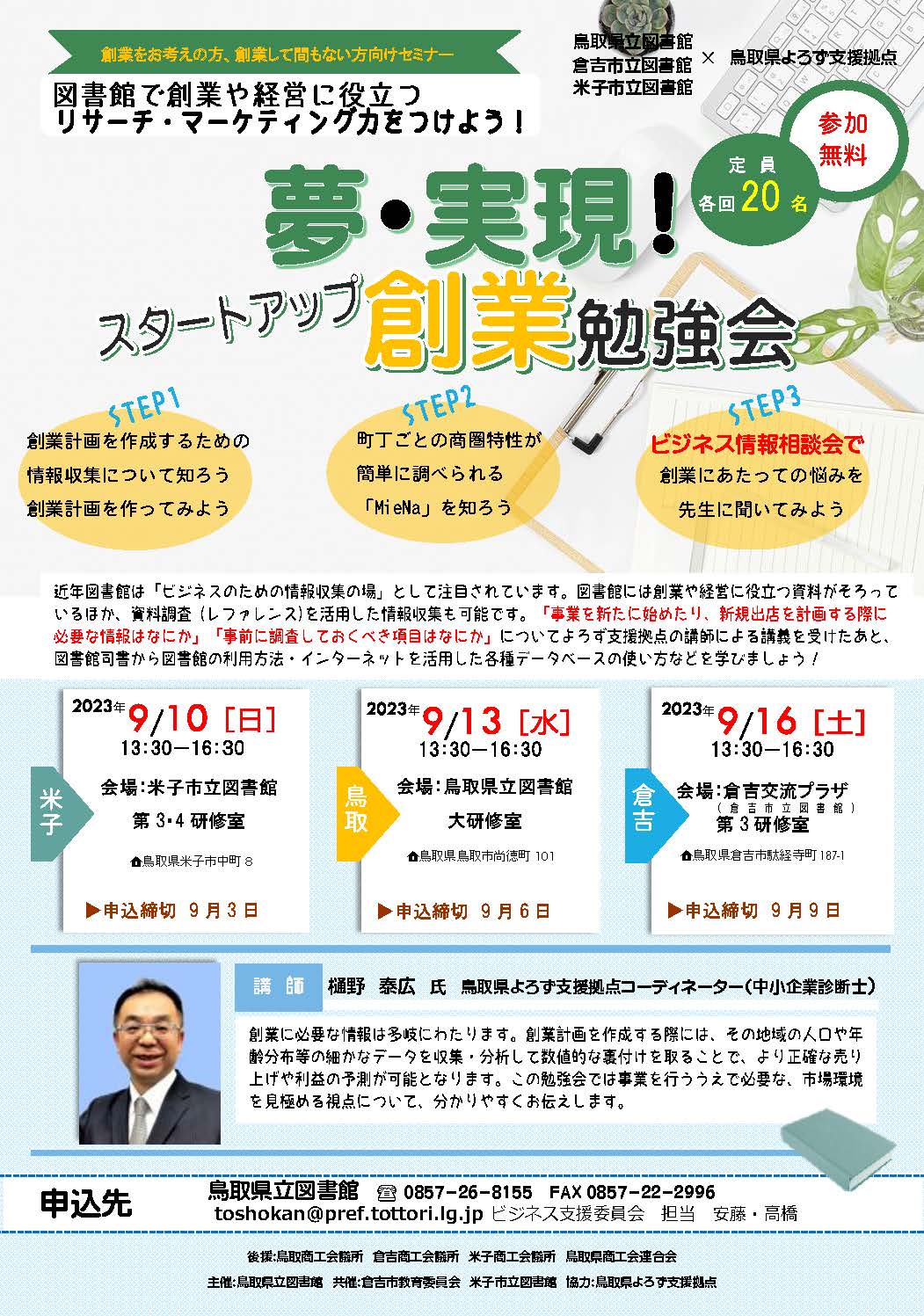 - 【募集は終了しました】(鳥取県立図書館より)9/10米子市立図書館、9/13鳥取県立図書館、9/16倉吉市立図書館「夢・実現!スタートアップ創業勉強会」開催のお知らせ
