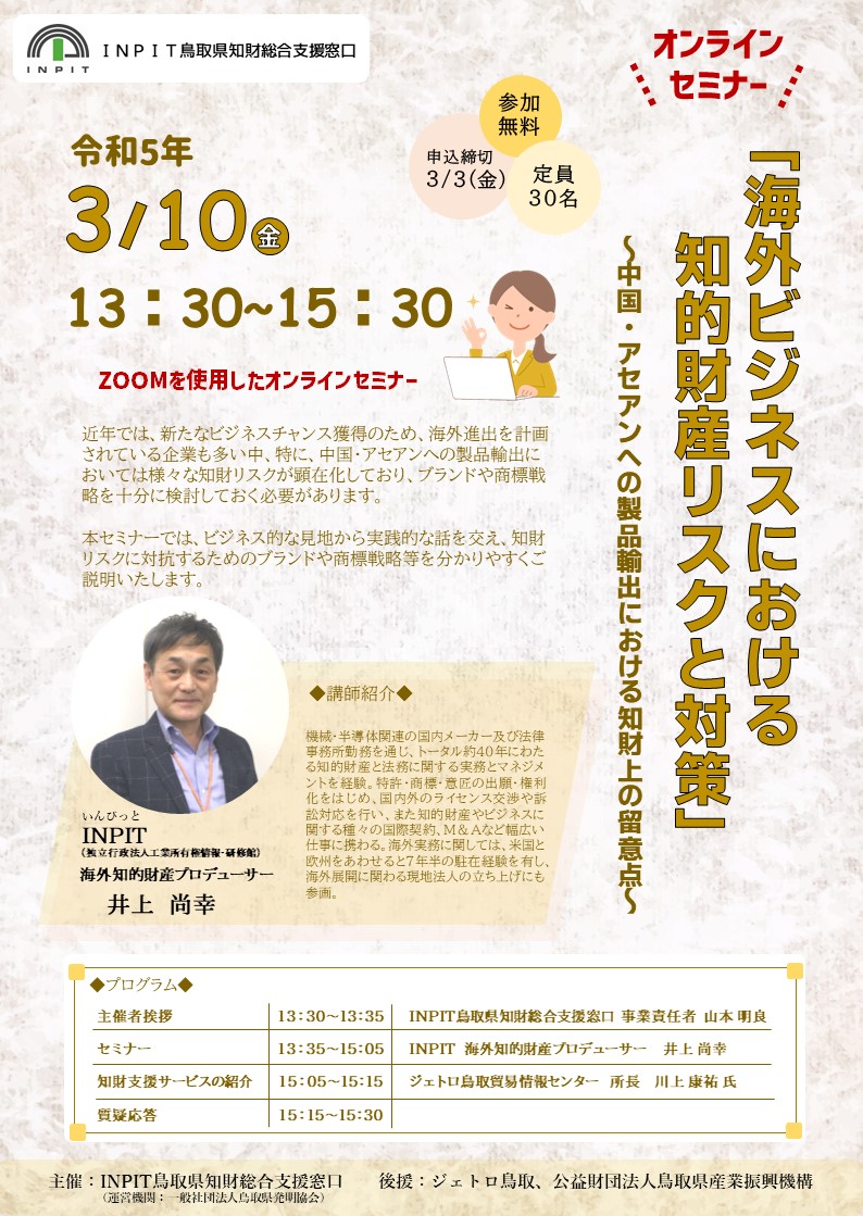 - 【募集は終了しました】「海外ビジネスにおける知的財産リスクと対策」 ~中国・アセアンへの製品輸出における知財上の留意点~オンラインセミナー開催について