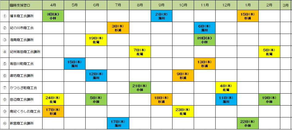 地域の商工会議所、商工会の協力により、県下各地で臨時の支援窓口を設け、地域の相談者の利便性を図ります。(無料)