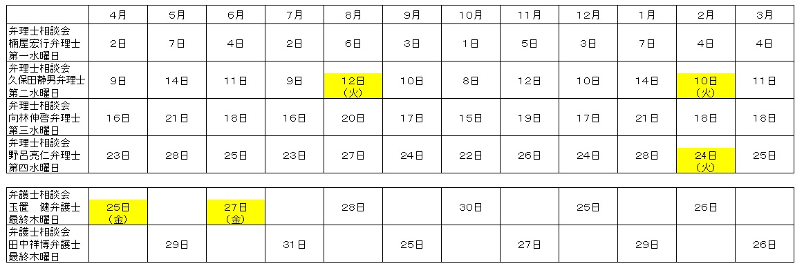 弁理士が毎月第1から第4水曜日、知財を得意とする弁護士が毎月最終木曜日、午後(13:30~16:30)、窓口に常駐します。高度な専門性の高い課題や知的財産を巡る訴訟など、知財に関する幅広い相談に無料で対応します。※黄色マーカー(祝日等により別日にシフトしております。)