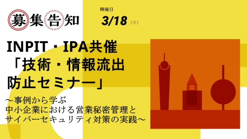 INPITは令和7年3月18日(火曜日)、IPA(独立行政法人 情報処理推進機構)と共催で、「技術・情報流出防止セミナー ~事例から学ぶ 中小企業における営業秘密管理とサイバーセキュリティ対策の実践~」をオンライン開催します(参加無料)。