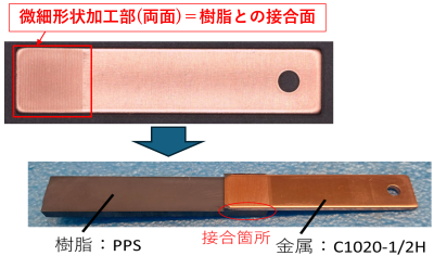 さらに、GoTech事業における「樹脂と金属の接着剤レス接合工法」の開発過程で、専門家(下田一弘弁理士)を派遣して発明の発掘に係る支援を行いました。その結果、早期に特許出願を行うことができ、大阪・関西万博での技術PRの機会を得ることができました。高精度の金属プレス加工技術を用いることにより、接着剤が不要な金属・樹脂接合(右の写真)を、接着剤を用いた金属・樹脂接合と遜色ないレベルで提供できる技術を開発できました。