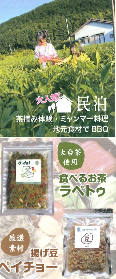 2023年、大台町に茶畑付の民家を購入して移住しました。そこから、猿忌避剤、ミャンマー食品の販売事業を立ち上げ、更に民泊事業とこの2年で一気に事業を拡大しました。