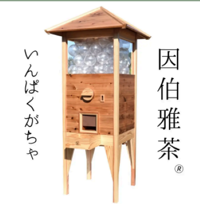 2023年7月に、木製のカプセルトイ(通称ガチャガチャ)の商品を開発したことをきっかけに再訪しました。高さが170cmで屋根は方形屋根、木札を用いた「からくり構造」のユニークな商品で、今後、商品のプロモーションを進めて拡販したいとの意向があり、専門家(中西弁理士)による知財ミックスの支援を行い、商標登録(因伯雅茶・いんぱくがちゃ 登録675934))、意匠登録(意匠登録1760512)、実用新案登録(実登3249560)に向けて支援しました。
